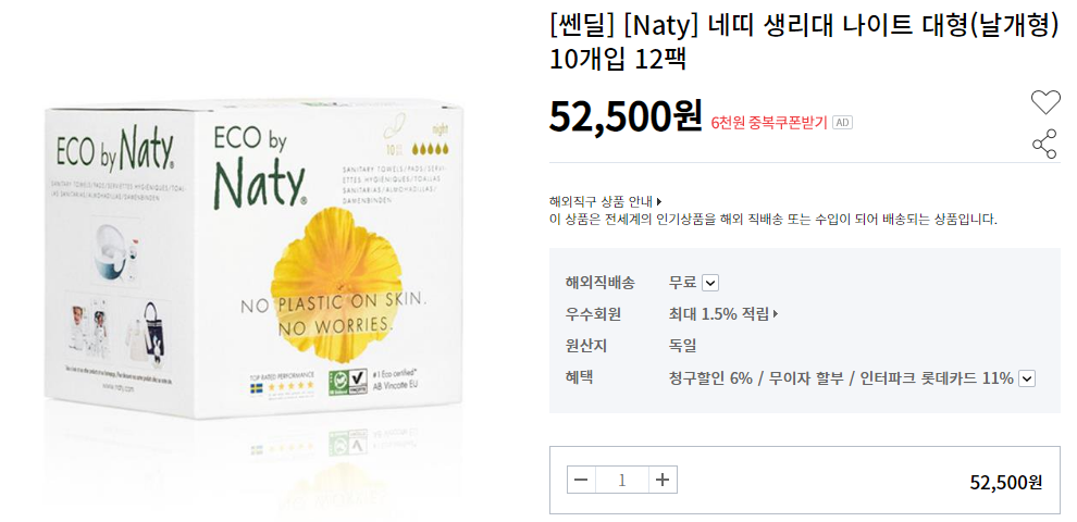 직구 대행 통해서 네띠 생리대 대형 12팩 52,500원에 구매했어요