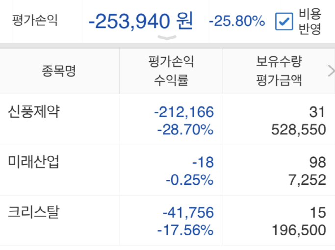 마이너스인 주식을 탓해야 하나 뭣 모르고 들어간 날 탓해야 하나 한 참 오를 때 진입하고, 뭣 모르고 들어간 주식 초보에게 요행은 없었다가 맞을 듯 탓은 무의미! 그저 잔인하다고 느껴지기는 하네 신풍 -28.70%..