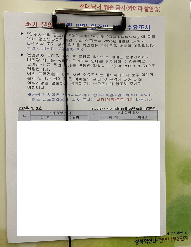 2020년 8월 조기분양에 대한 주민 의견을 묻는 전단지가 붙어있네요