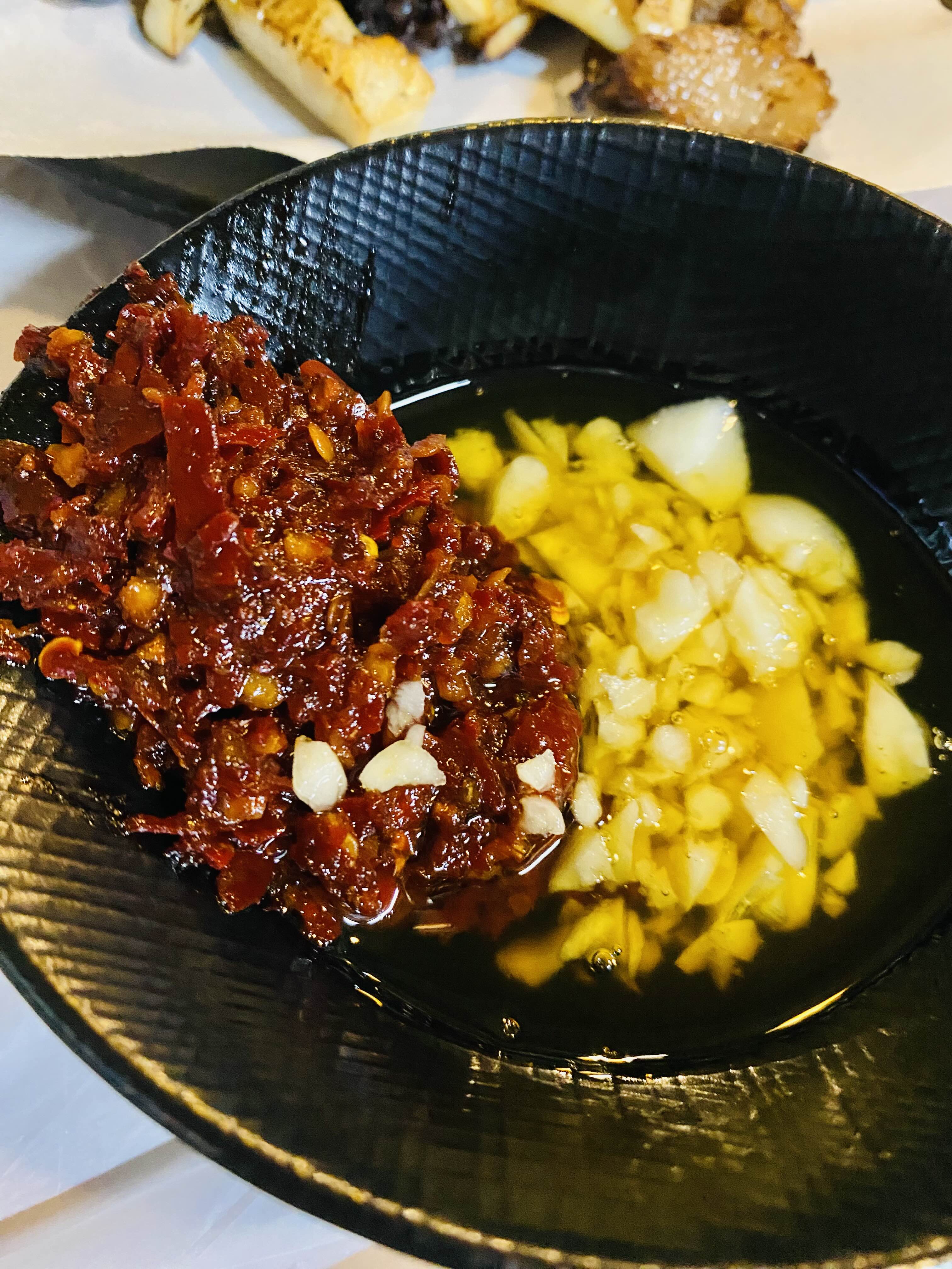 뭉티기를 찍어 먹으면 크하 어질하네요