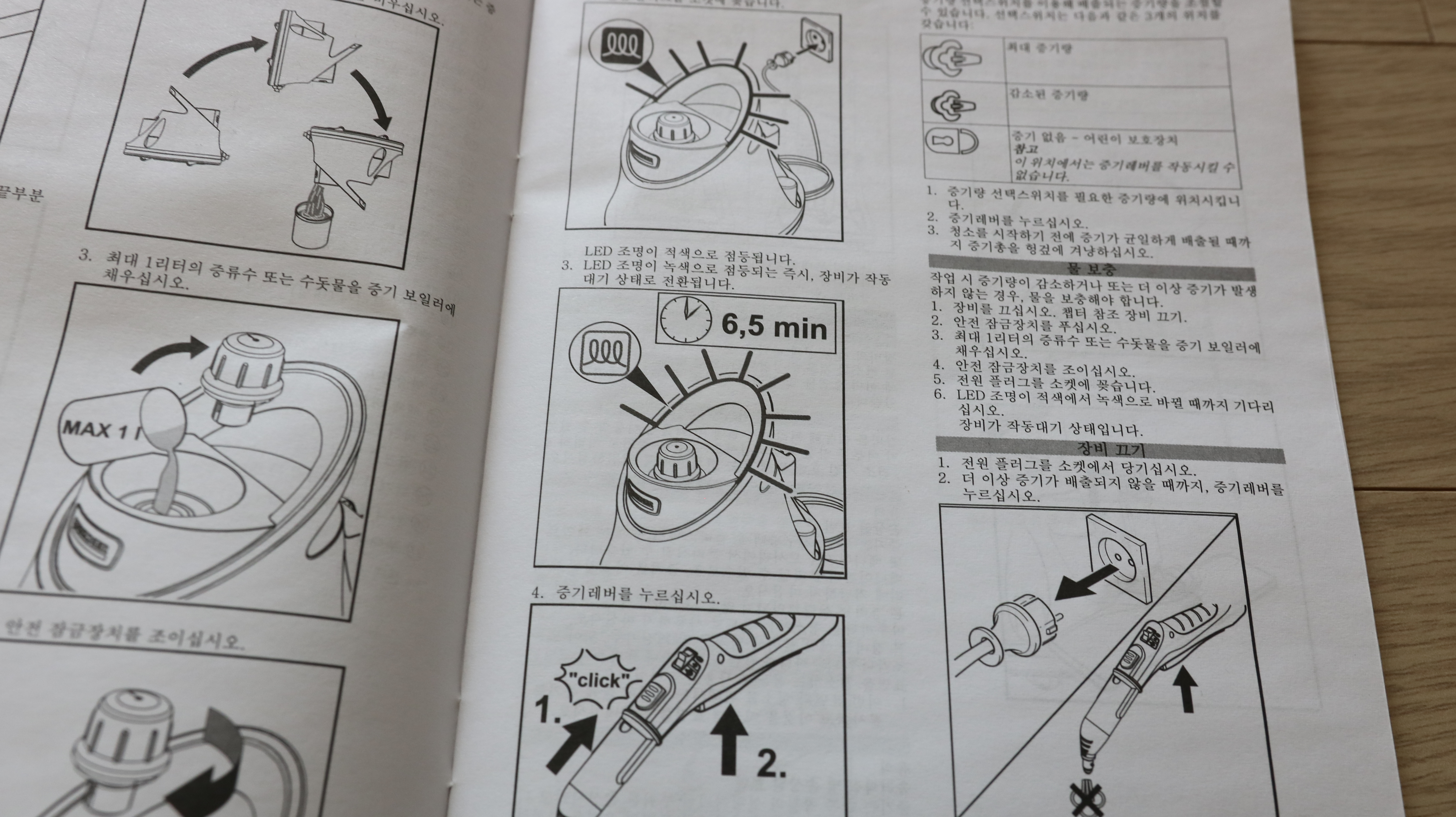v. 손잡이에 버튼을 눌러야 스팀 분사가 되는데 (자동 아님)