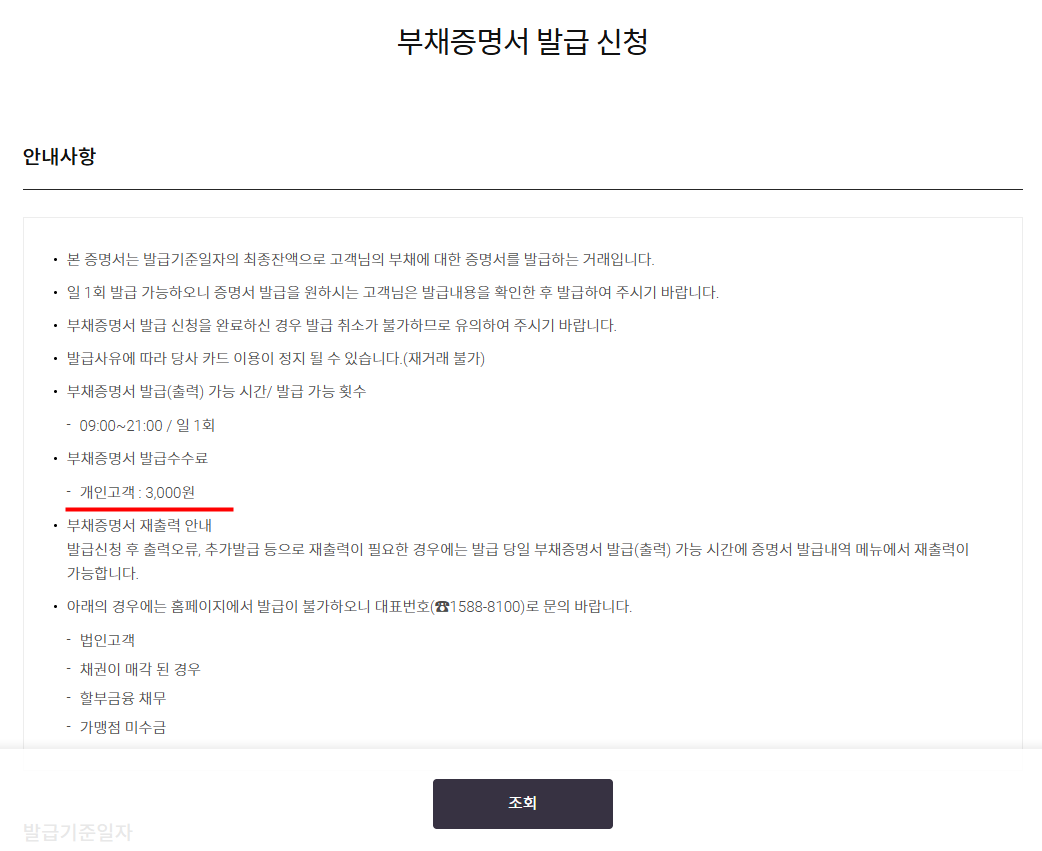 고객센터 - 제증명발급 - 부채증명서 발급신청
