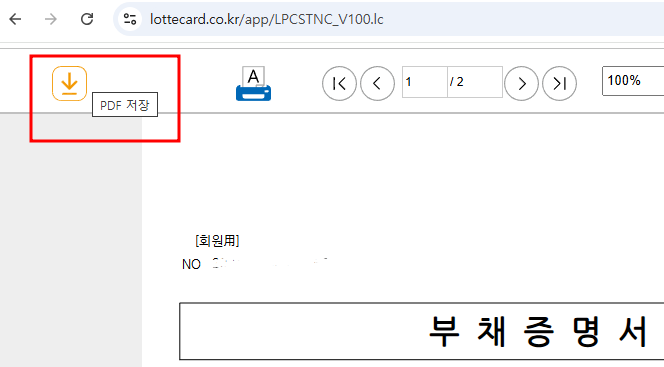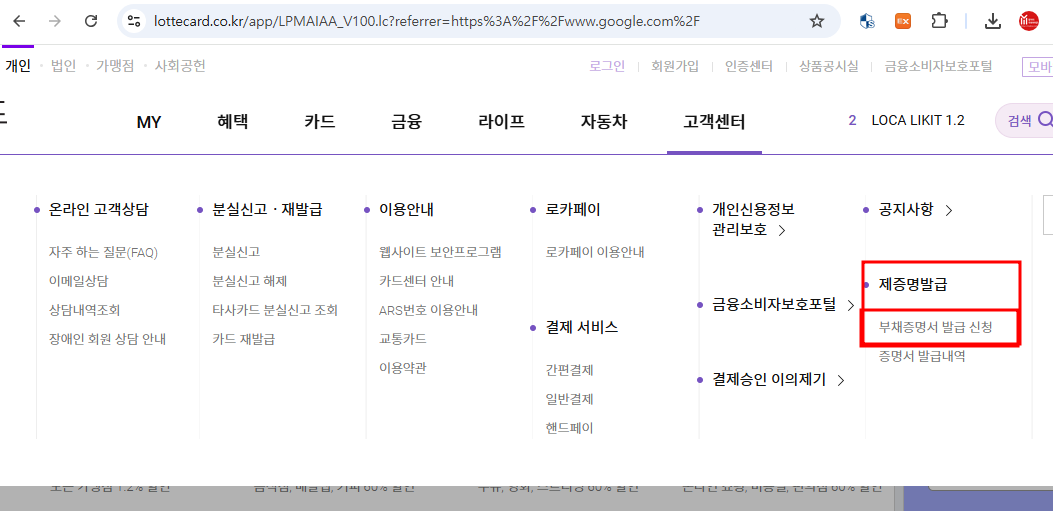 컴퓨터로 신청하는 롯데카드 부채증명서의 경우에는