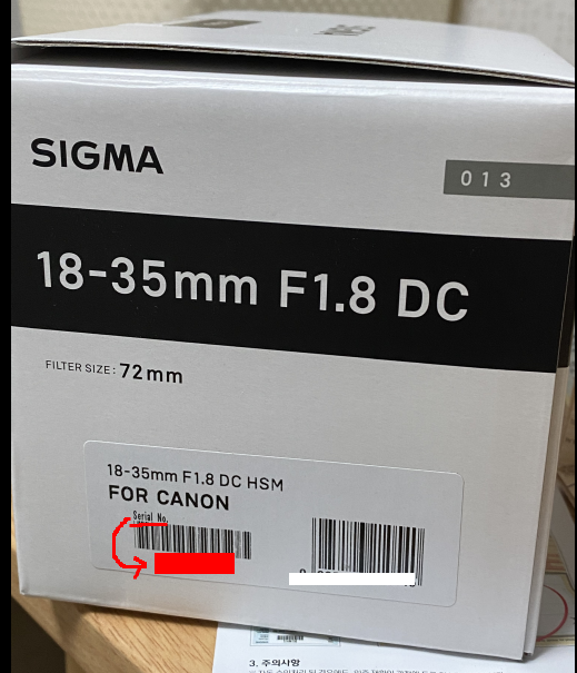 시그마 렌즈 시리얼은 박스에 겉면에 있네요