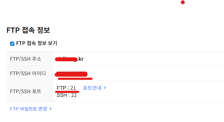 카페24 호스팅 관리 --> 서비스 접속관리 --> FTP 접속 정보
