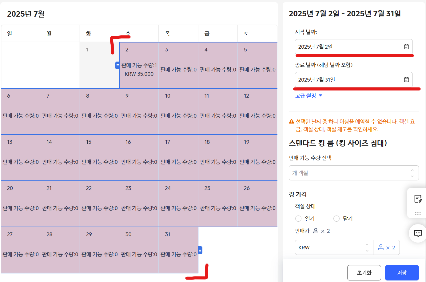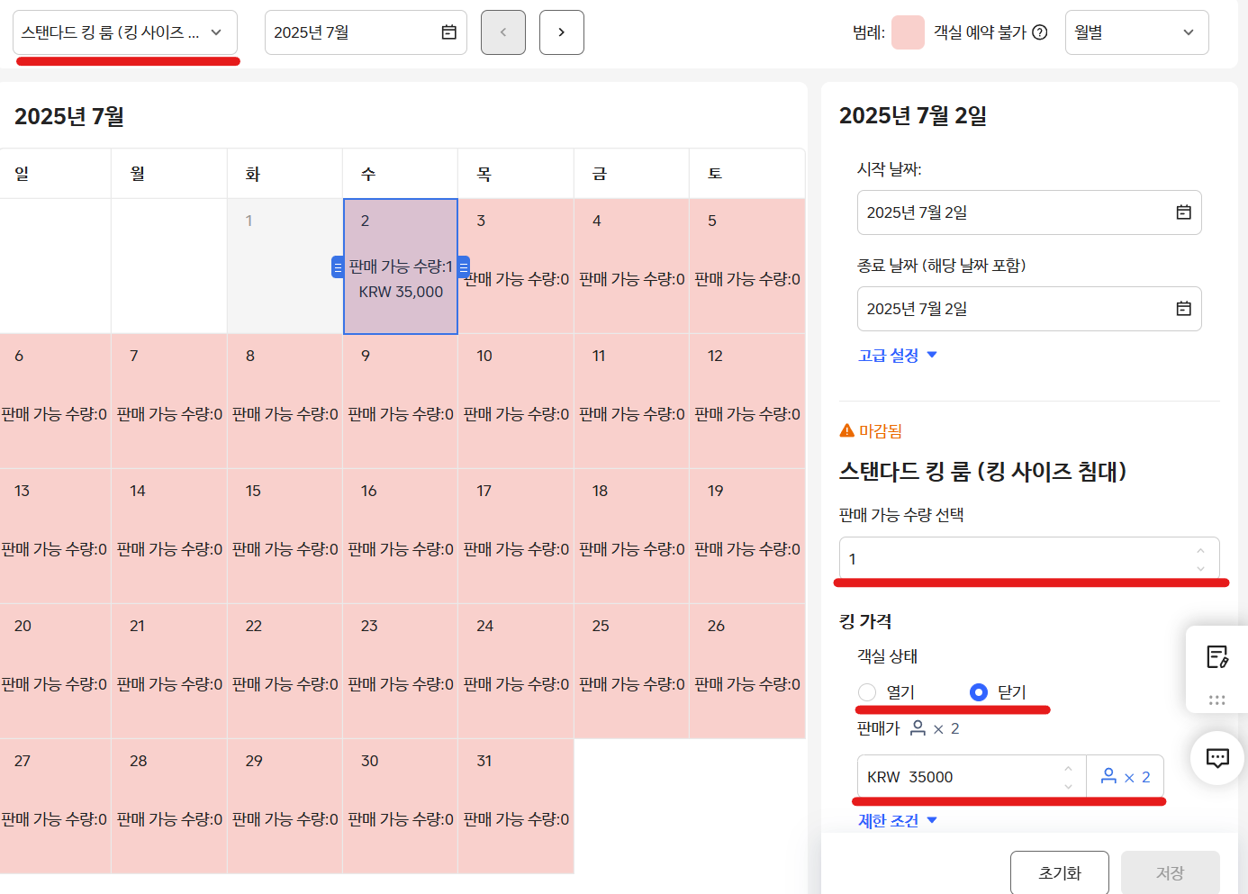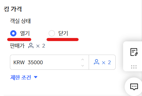 우측 창에서 가격과 객실을 몇 개를 팔 것인지를 입력해주면 된답니다.