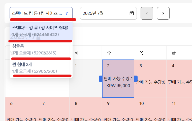 저는 3가지 객실 타입이라 3개가 표시 되는거에요