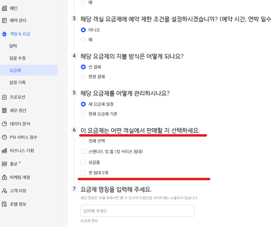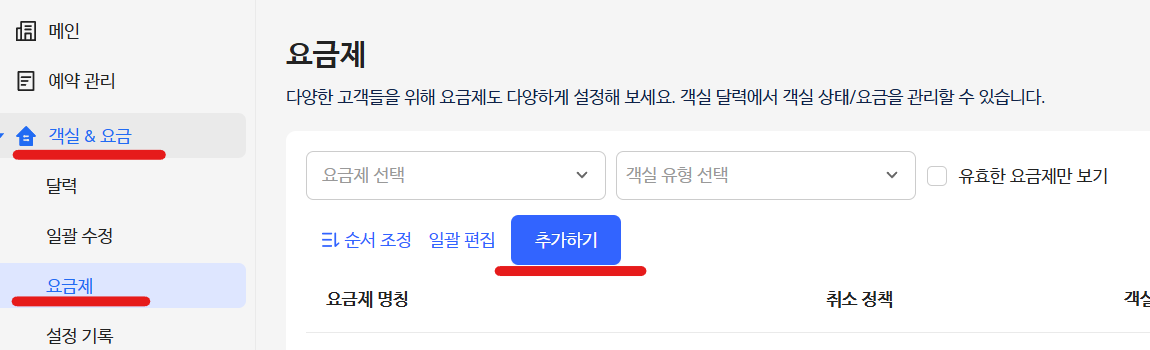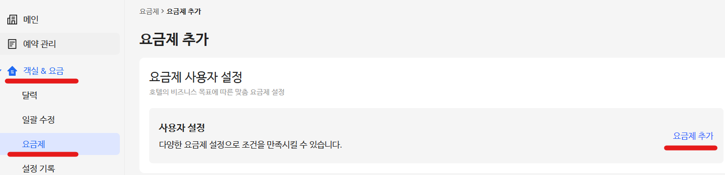 객실 & 요금 -> 요금제 -> 추가하기