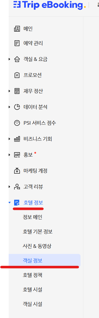 좌측 메뉴에서 호텔정보 - 객실 정보 클릭