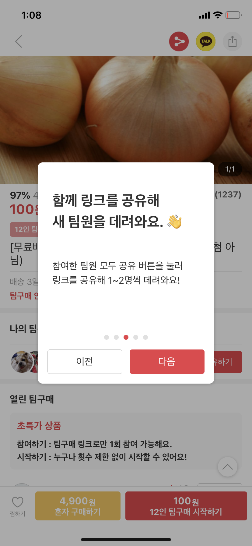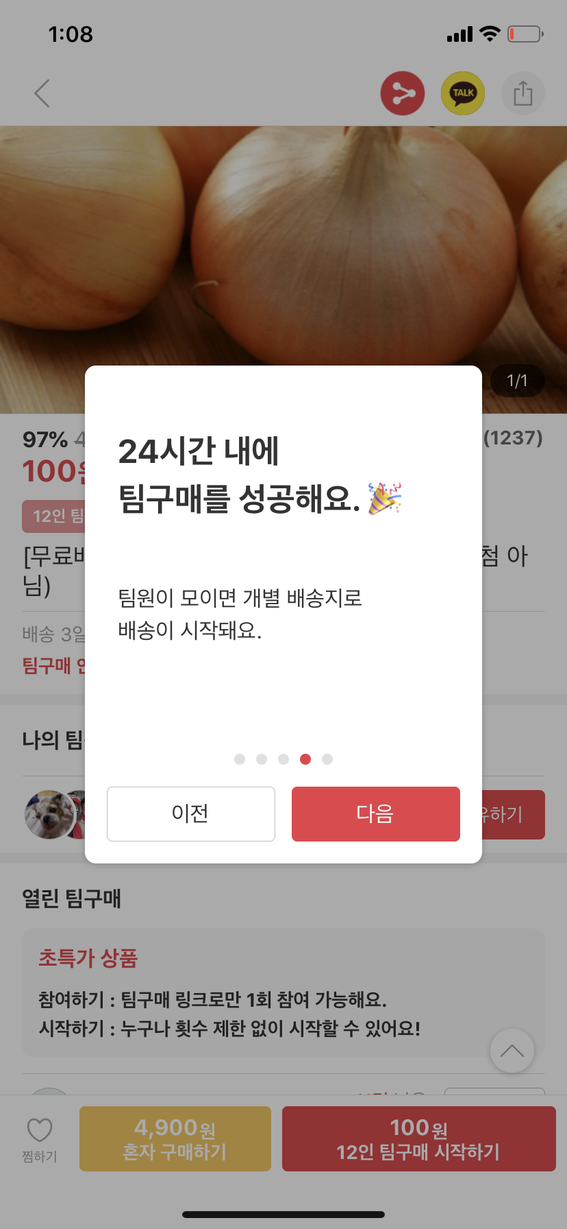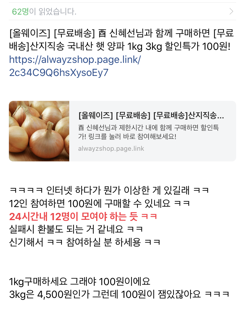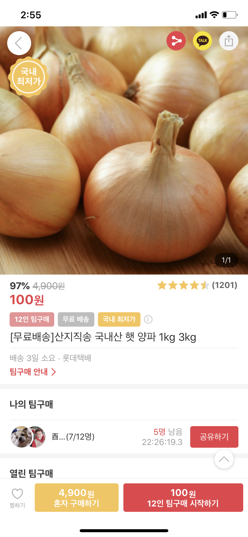 양파는 이제 100원 팀구매 종료하는 것 같네요