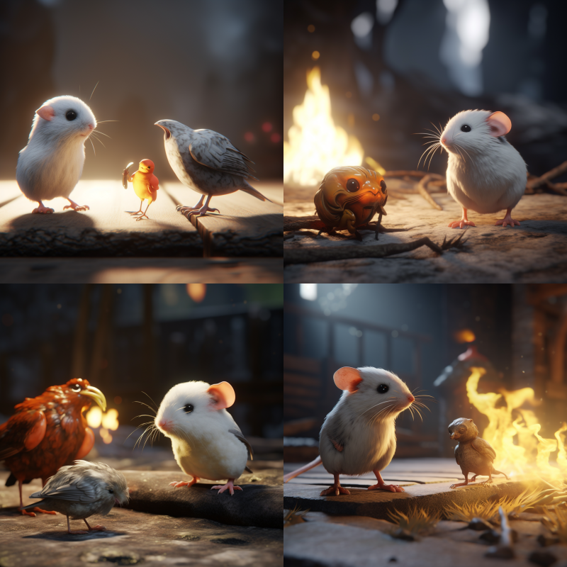챗지피티 번역: 매우 작은 불타는 쥐, 흰색 큰 새 바로 옆에