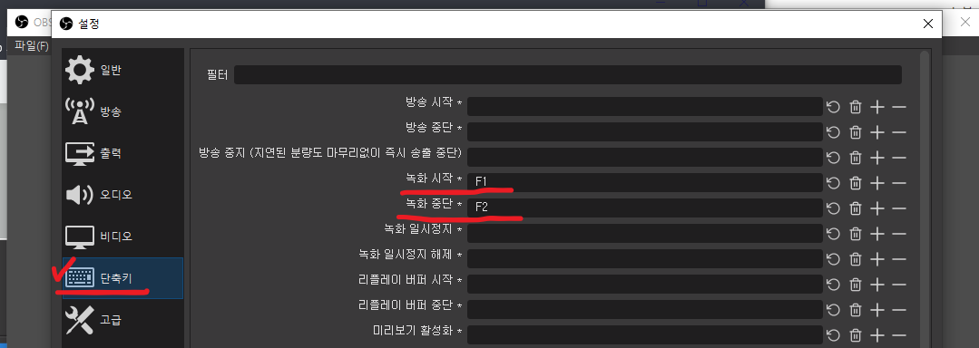 녹화 시작과 녹화 중단에 단축키를 입력해 둠