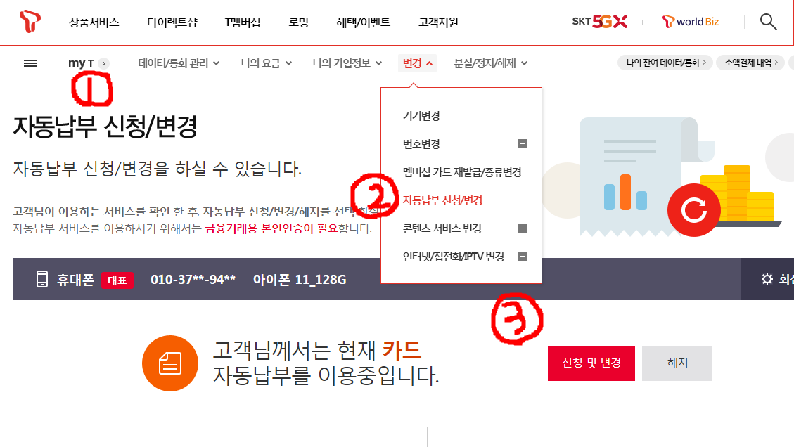 my t -> 변경 -> 자동납부 신청/변경 페이지로 간 후