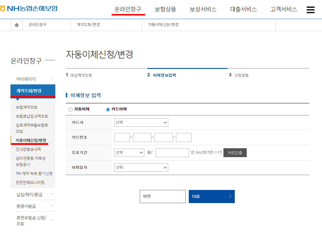 농협손해보험도 온라인으로 자동납부신청 및 카드 결재가 가능하네요